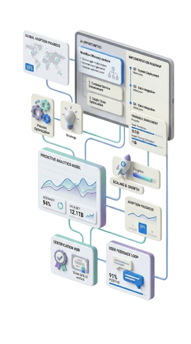 Our services are designed to support businesses at different stages of AI adoption, from early strategy and consulting to full implementation and training.
